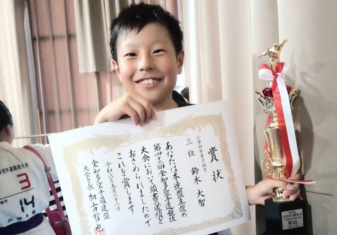 5月4日 組手試合 三位 木村 亮太 三位 平田 輝  木村亮太くんは予選リーグ1位、平田輝ちゃんは予選リーグ2位通過し、決勝トーナメントに出場しました! 2人共決勝トーナメントでは3位入賞です。